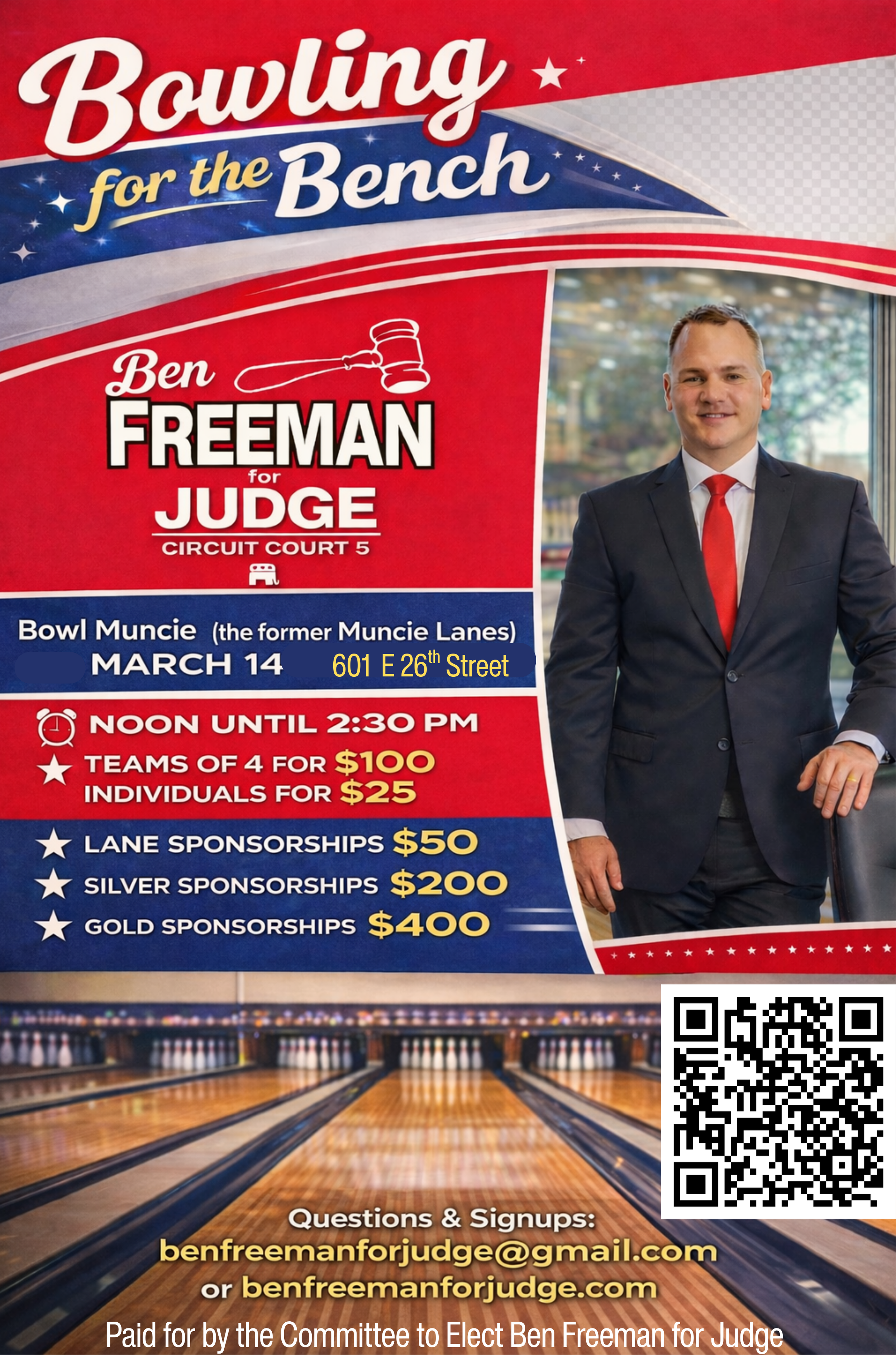 Please register below to sign up for the Ben Freeman for Judge Bowling Fundraiser at Bowl Muncie!