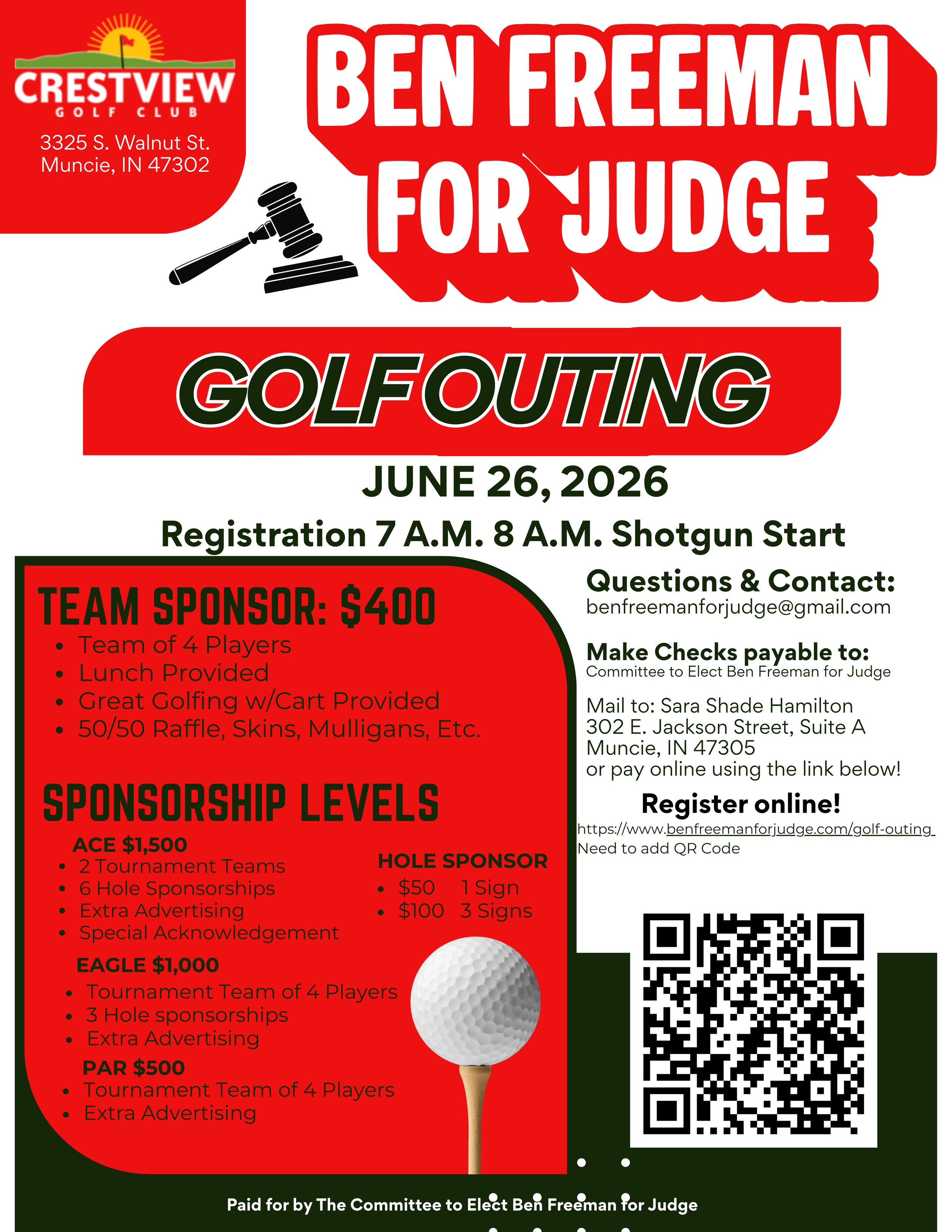 Please register below to sign up for the Ben Freeman for Judge Golf Outing at Crestview Golf Club using the fields below! After you complete your registration, you may also use the “Pay Online Here” link to make an electronic payment. Thank you for your support!